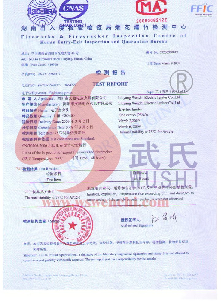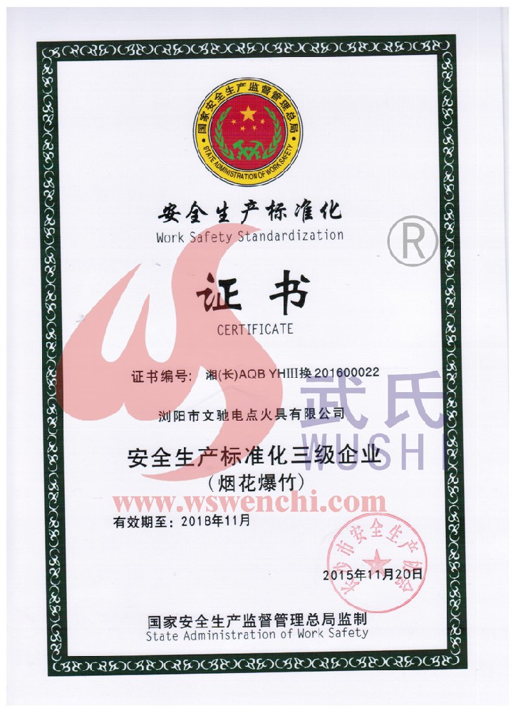 瀏陽市文馳電點(diǎn)火具有限公司(原培文電子點(diǎn)火器材廠),創(chuàng)建于1998年,是一家專業(yè)從事研制銷售電子點(diǎn)火產(chǎn)品的民營科技企業(yè),是我國第1枚煙花用電點(diǎn)火頭生產(chǎn)者,是《煙花爆竹電點(diǎn)火頭國標(biāo)》牽頭起草單位。公司位于中國“煙花之鄉(xiāng)”湖南省瀏陽市,地理位置優(yōu)越,交通便利。 我公司研制的對(duì)象是用電能引燃火藥、做機(jī)械功等預(yù)定功能的一次性使用的元件或裝置,包括電點(diǎn)火頭(英文名ElectricMatch or Electric Igniter,中文俗稱“電火柴”或“電發(fā)火頭”)、電點(diǎn)火管和延期電點(diǎn)火管;我們估且在以后的產(chǎn)品技術(shù)欄中將我們研究的產(chǎn)品統(tǒng)稱為電點(diǎn)火具,將電點(diǎn)火器看成是用于提供和控制供給電點(diǎn)火元件點(diǎn)火的電能器材;我們研究的電點(diǎn)火橋路有橋絲式、無橋絲···
